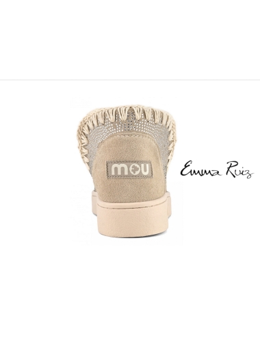 Novedad MOU para la PV24, las sneakers eskimo se han actualizado con hotfix tono sobre tono para un toque brillante perfecto para el verano. Confeccionadas con ante de primera calidad, este modelo artesanal es ligero y cómodo. Con las costuras de ganchillo típicas de mou, forro de lona de algodón a rayas de dos tonos, una plantilla acolchada de ante, soporte de apoyo para el talón y suela flexible de goma. Altura 13 cm.