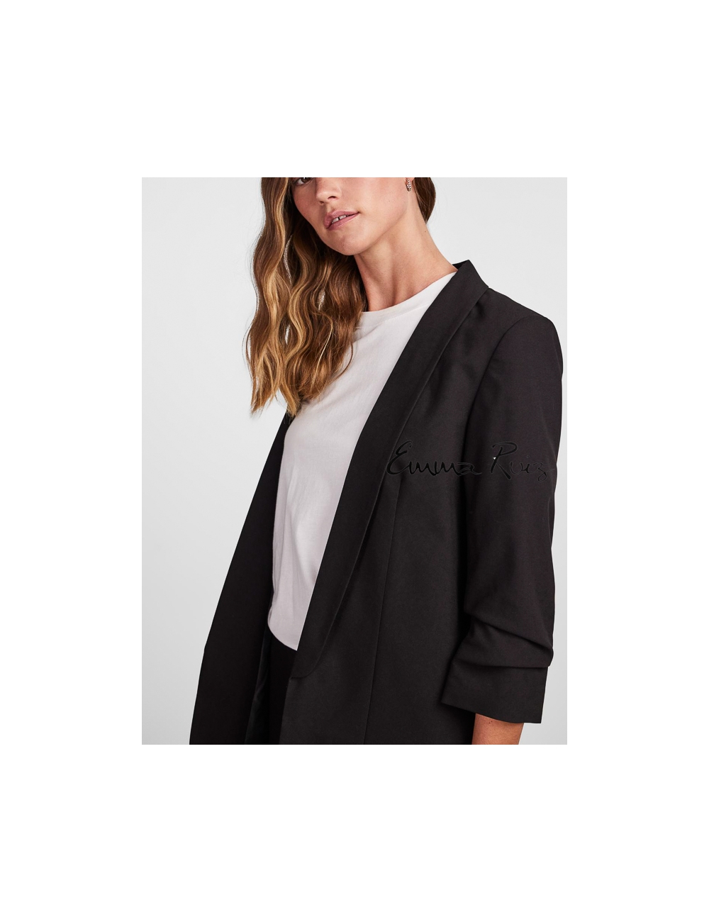 Americana larga PIECES con solapa chal y mangas 3/4 con detalles fruncidos. Totalmente forrada y ajuste regular, ideal para las tardes de primavera.