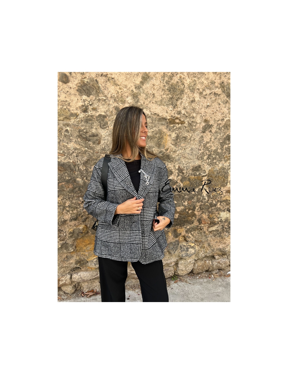Corte: Oversize; Color: Gris con cuadros; Material: Poliéster, viscosa y elastan y con detalles como Broches amovibles, aberturas en la espalda