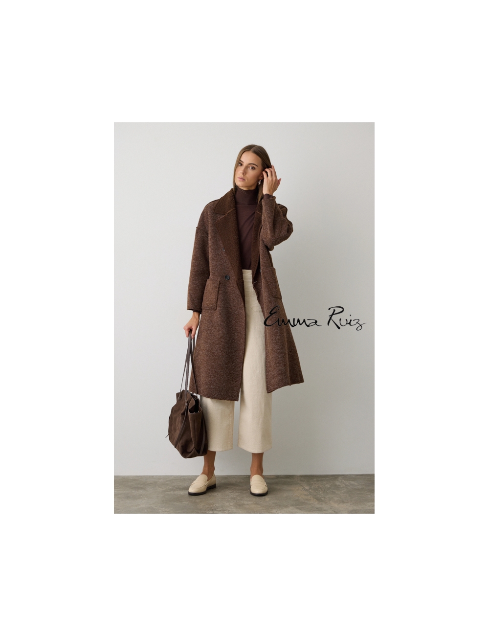 El diseño incluye mangas largas, cuello con solapa y un cierre con botones frontales, aportando un toque clásico y sofisticado. El forro interior en tejido bouclé garantiza abrigo y comodidad, mientras que los bolsillos laterales y el corte holgado lo convierten en una prenda versátil, ideal para combinar con jeans, vestidos o pantalones de vestir.